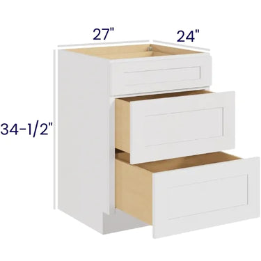 White Shaker - 27" 3-Drawer Base Cabinet - 27"W x 34-1/2"H x 24"D - 3DRW