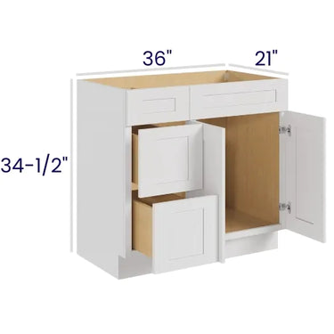 White Shaker - 36" Vanity Sink Base - 36"W x 34 1/2" x 21"D - 1D, 3 Left DRW